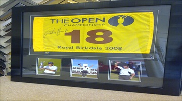 A signed flag from the 18th hole at Royal Birkdale and three photo's taken by the customer during the 2008 Open Championship.