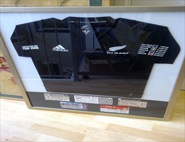 All blacks rugby shirt with five match tickets mounted underneath.